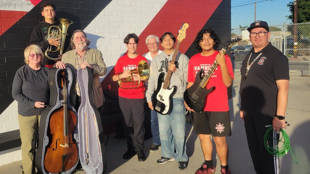 On January 29th, Banning High School Band Director Javier Ortiz received a cello, French horn, mellophone, guitar, and bass from Collage. The Ortiz is joined by students, Richard Foss and Mary Saunders of Collage, and John Schuricht from Peninsula Rotary Club, a major sponsor of our program.